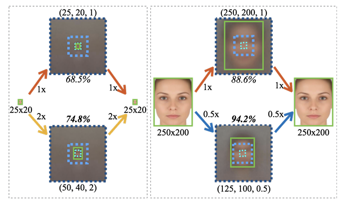 따라서 작은 얼굴 탐지를 위해서는 실제 크기에 맞는 template보다 2배 큰 해상도에서 template을 적용하는 것이 더 효과적이며, 큰 얼굴의 경우는 반대로 해상도를 낮춰서 중간 크기 template을 사용하는 것이 효율적이다.