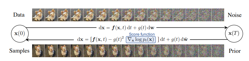 $$ d\mathbf{x} = [\mathbf{f}(\mathbf{x},t) - g(t)^2 \nabla_\mathbf{x} \mathrm{log}\,p_t(\mathbf{x})]dt + g(t)d\bar{\mathbf{w}} $$