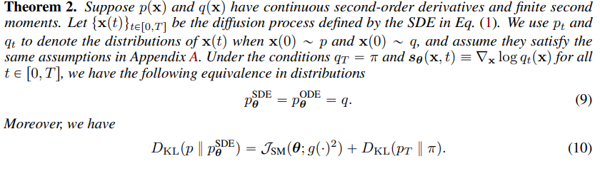 즉 이상적인 조건 하에서, 우리의 training objective가 NLL과 같고, 심지어 p_ODE랑 p_SDE의 확률분포도 같아진다. 하지만 이는 우리의 모델이 score를 완벽하게 학습하다는 비현실적인 조건을 가지고 있어, 현실적으로는 실현 불가능하다. 즉 실제로는 $\mathcal{J}_{DSM}$을 최소화하는 학습 방식이, $p_\theta^{SDE}$의 NLL의 상한을 낮춰주기는 하지만, $p_\theta^{ODE}$의 NLL까지 낮춰준다고 할 수는 없다.