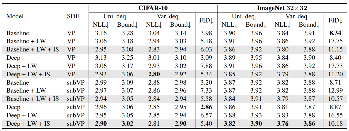 논문에서는 여러가지 데이터, 여러가지 모델을 이용하여 likelihood weighting(LW), importance sampling(IS), Variational dequantization(Var. deq.)의 효과를 교차검증하였다. 실험결과는 아래와 같다.