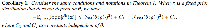 Theroem1과 마찬가지로 $\mathcal{L}_\theta^{SM}$과 $\mathcal{L}_\theta^{DSM}$이 $-\mathrm{log}p_\theta^{SDE}$까지 upper bound한다 보장할 수는 없다. 하지만 이론적으로 $s_\theta(\mathbf{x},t)$가 $\nabla_\mathbf{x}\mathrm{log}p_t(\mathbf{x})$를 충분히 근사하도록 학습되면, boundness도 충분히 보장될 수 있고, 이 또한 실험 과정에서 모든 데이터들에 대해 실험적으로 확인 가능했다.