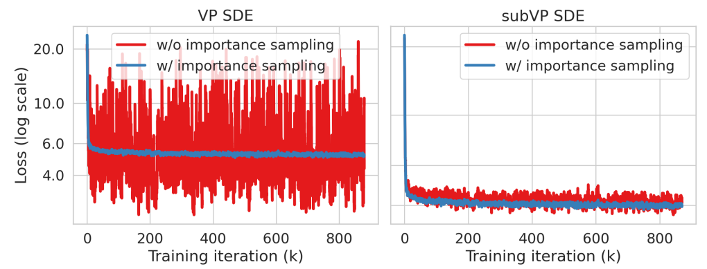 기존에는 적분값을 평가하기 위해 $[0,T]$의 균등분포에서 $t$를 샘플링한 후, 적분값을 계산하여 $g(t)^2$에 비례하게 분산이 커졌었다. 하지만 importance sampling을 적용하여 $p(t)$에서 시간 $\tilde{t}$를 샘플링한 후 $\alpha(t)^2$을 계수로 한 loss 값을 더 적은 분산으로 구할 수 있다.