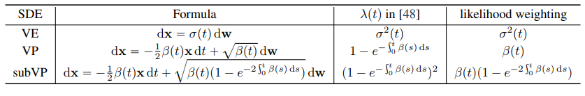 VE, VP, Sub-VP SDE의 경우 아래와 같이 구체적으로 아래와 같이 $\lambda(t)$를 설정한다.