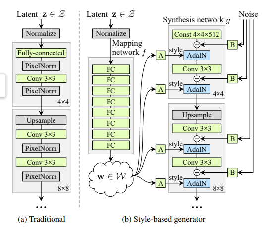 본 논문은 style transfer 기법을 차용하여 GAN을 위한 generator 아키텍쳐를 제안한다. 이 방식은 unsupervised 방식으로 1) high level attributes (포즈나 정체성 같이 큰 구조를 결정하는 특성)과 2) stochastic variation (주근깨,머릿결 같은 무작위적 세부 요소)의 분리를 가능하게 했다. 또한 interpolation과 disentanglement 측면에서 기존 방법들보다 우수한 성능을 보였는데 본 논문은 이 두 특성을 측정할 수 있는 새로운 metrics를 제시하고 새로운 human face dataset도 소개한다는 contribution을 가진다.
