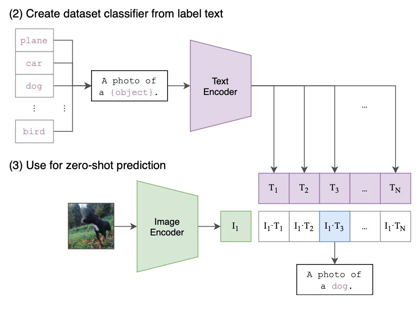 (2) 그림을 보면 주어진 템플릿 'A photo of a {object}' 의 빈칸에 각 레이블에 해당하는 단어를 넣고 Text Encoder를 통해 벡터화 시킨다(T1 ~ Tn). (3)에서는 Zero shot 이미지를 인코딩 한 후 각 텍스트와 매칭시킨다. 그 중 가장 유사도가 높은 레이블을 이미지의 클래스로 예측한다.