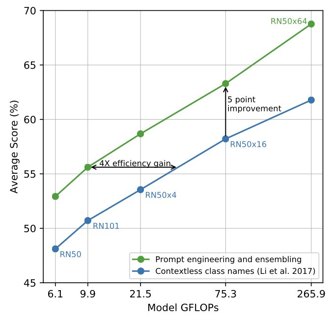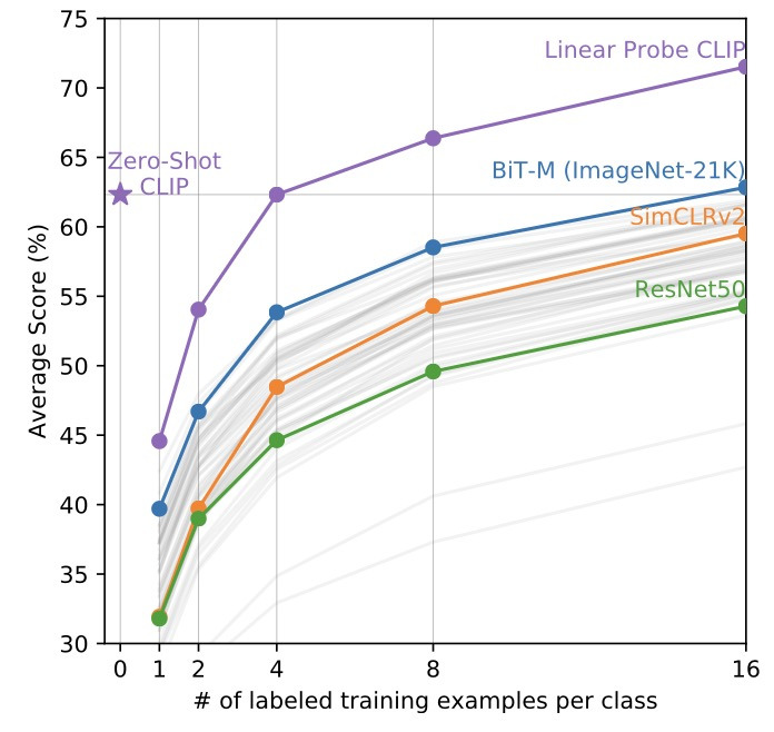 다음은 CLIP에서 Zero-shot 모델을 다른 모델의 Few shot 모델과 비교한 결과이다. 타 모델은 최소 16-Shot 모델이 되었을 때 Zero-Shot Clip과 성능이 유사해졌다.