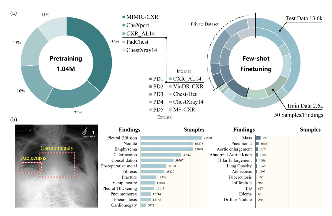 총 104만 개의 CXR 이미지를 포함하는 데이터셋(30.5%: 개인 데이터셋, 69.5%:공개 데이터셋)