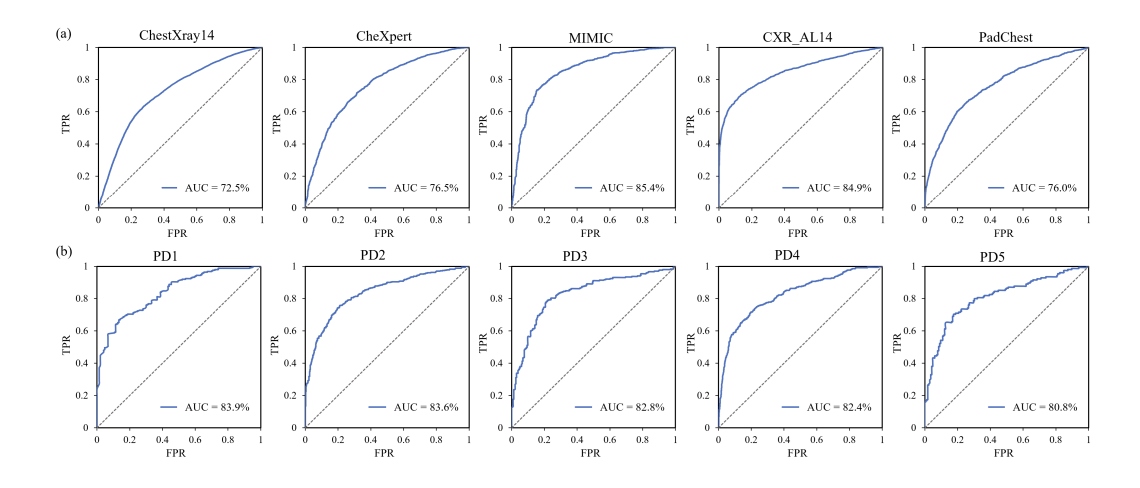 - 높은 AUROC 값:SL-ImageNet (p < 0.001) , SSL-ImageNet (p < 0.001)과 비교하여 통계적으로 유의미하게 높은 값