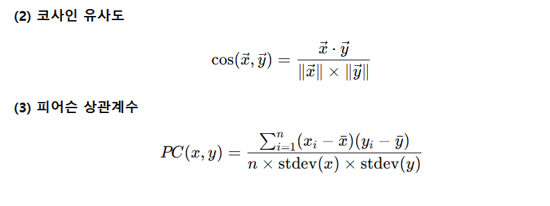 - 메모리 기반 방식에서는 일반적으로 두 가지 유사도 측정 기법이 많이 사용됨