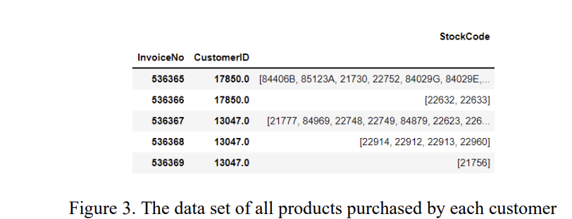 - 각 고객이 구매한 상품들을 하나로 묶어 새로운 데이터셋 구성 = 이 데이터셋에서는 각 행이 하나의 거래(인보이스)를 나타내며 해당 고객 ID와 함께 구매한 모든 상품 정보가 포함됨
