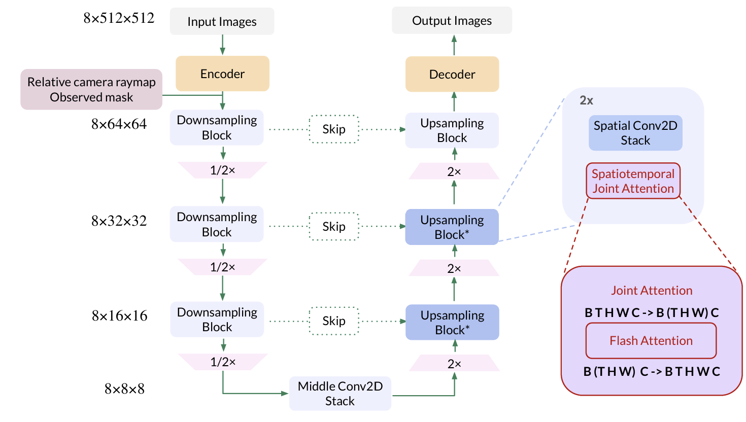 - 기존 Video LDM 기반 구조를 사용하되, 시간 정보 대신 카메라 포즈 임베딩(camera raymap)을 사용