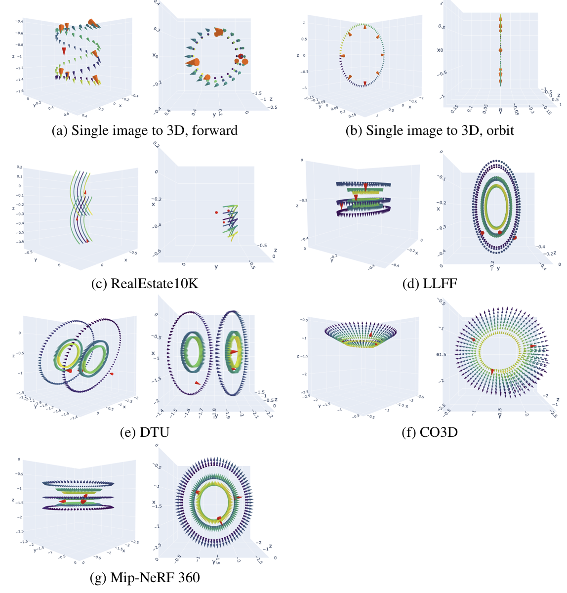 - 5개의 벤치마크 데이터셋 (CO3D, RealEstate10K [in-distribution], DTU, LLFF, mip-NeRF360 [out-of-distribution])에서 평가.