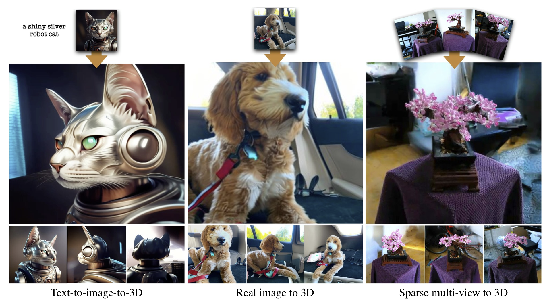 - 다양한 input (다중 뷰, 단일 이미지, 텍스트(text to image로 생성된 사진을 의미)까지)로부터 고일관성 novel view 생성.
