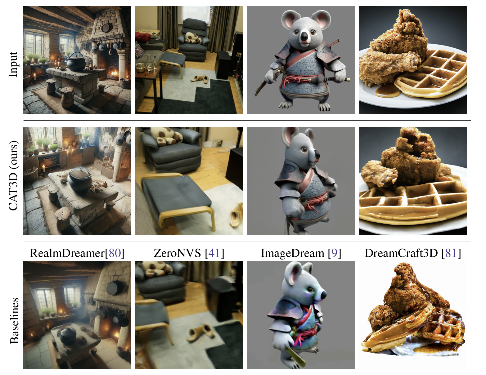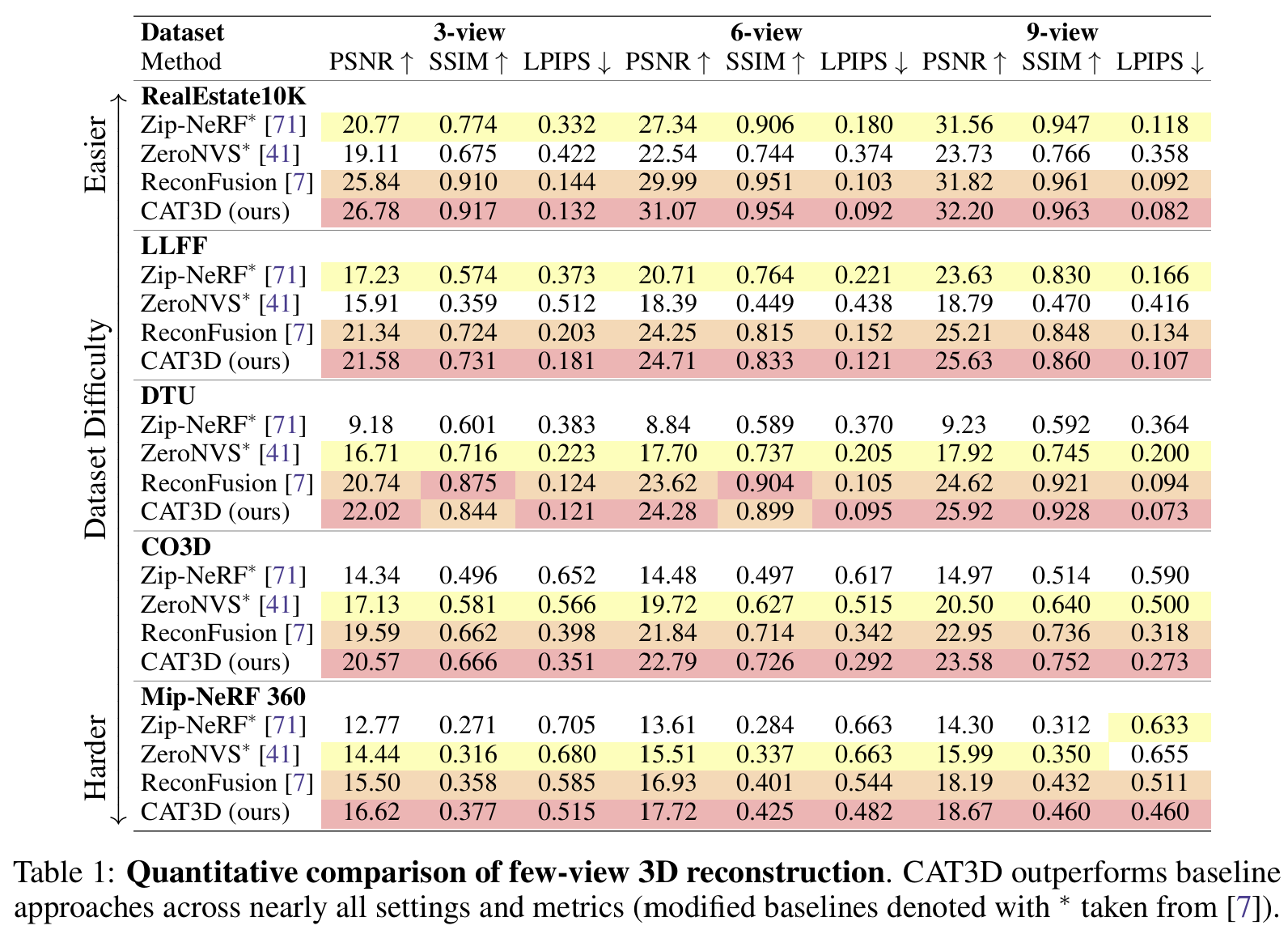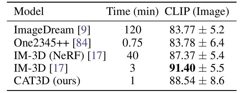 - CAT3D는 1분 이내에 3D 장면 전체를 생성할 수 있으며, 기존 단일 이미지 또는 소수 뷰 기반 방식보다 우수한 성능을 보임.