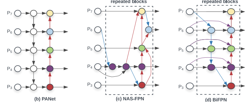 - NAS-FPN: NAS로 구조 자동 설계, 성능은 좋지만 매우 느리고 구조 해석이 어려움.