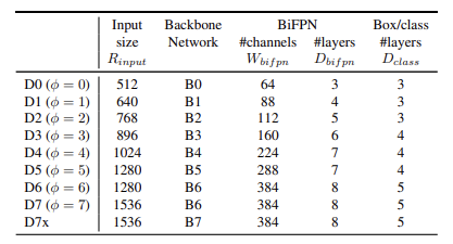 - φ 값에 따라 EfficientDet-D0(φ=0)부터 D7(φ=7)까지 개발
