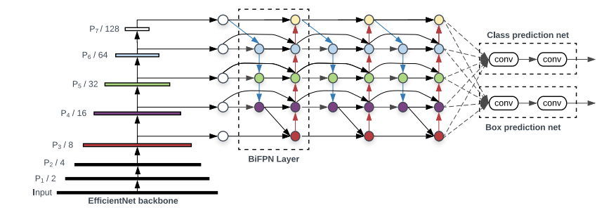 - 특징 네트워크: BiFPN (레벨 3-7 특징을 입력으로 받아 양방향 특징 융합 반복 적용)