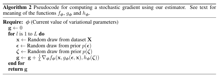 - 이를 누적 평균 형태로 합산:$$g \leftarrow g + \frac{1}{L} \nabla_\phi f_\phi(\mathbf{x}, g_\phi(\epsilon, \mathbf{x}), h_\phi(\zeta))$$