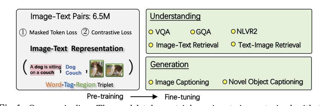 - V+L 이해 및 생성 과제를 위한 일반적인 이미지-텍스트 표현 학습에 효과적인 강력한 VLP 방법