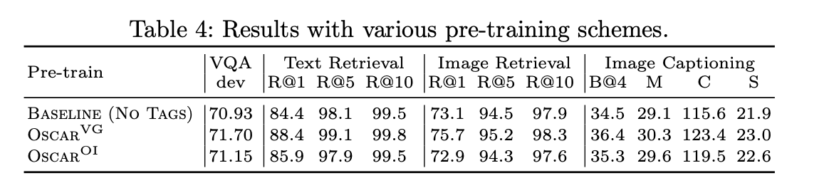 - 객체 태그를 활용한 미세 조정 학습 곡선이 태그 없이 수행한 VLP 방법보다 모든 과제에서 훨씬 빠르고 더 좋은 성능