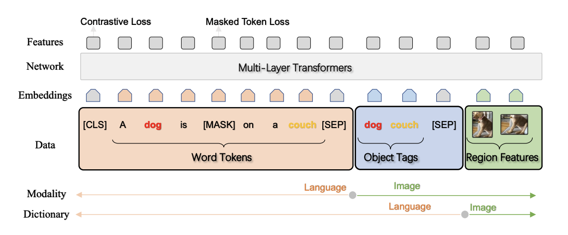 - 학습 샘플(tuple): 단어 시퀀스(word sequence), 객체 태그 집합(set of object tags), 이미지 영역 특징 집합(set of image region features)