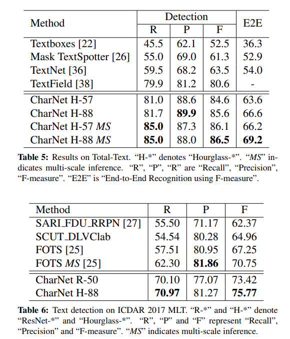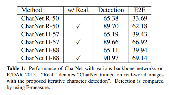 - 실제 이미지에 대한 문자 Annotation을 사용하는 Mask TextSpotter와 비교할 때 CharNet은 추가적인 수작업 없이도 Mask TextSpotter와 유사한 성능을 기록