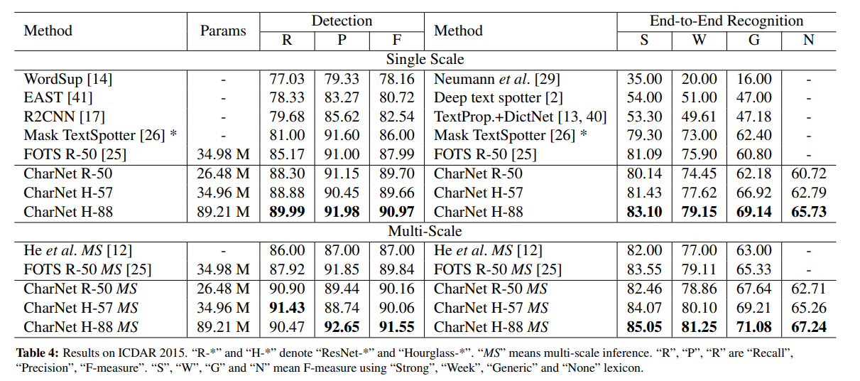 E2E Text Recognition Task를 SOTA (ICDAR 2015, Total-Text)와 비교했을 때 CharNet은 single-scale으로도 기존 SOTA모델들 보다 좋은 성능을 보였다.