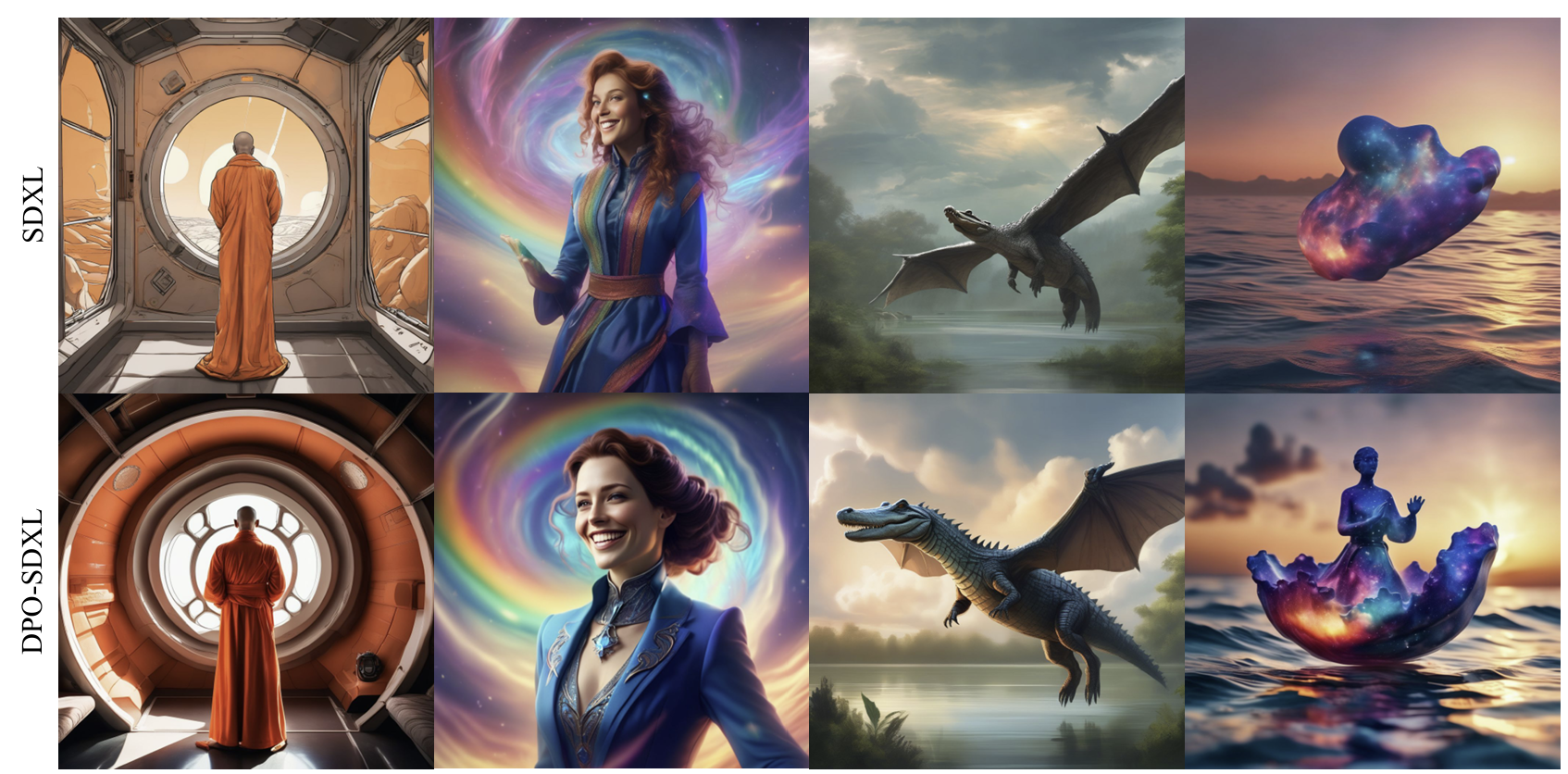 - DPO는 더 생생한 색감, 드라마틱한 조명, 좋은 구도, 사실적인 인물/동물 묘사를 생성