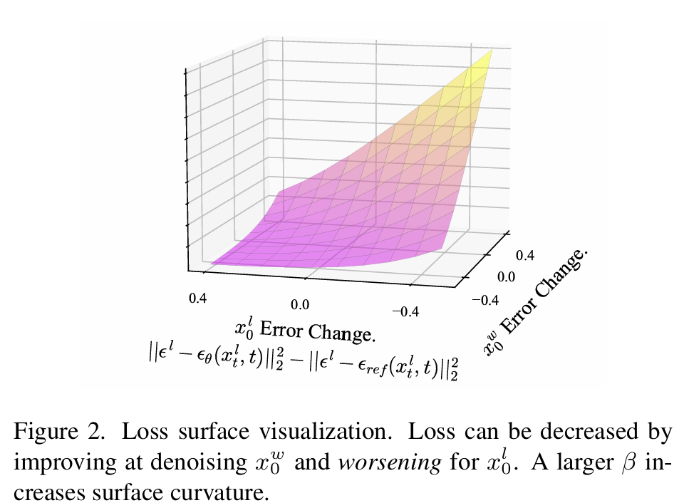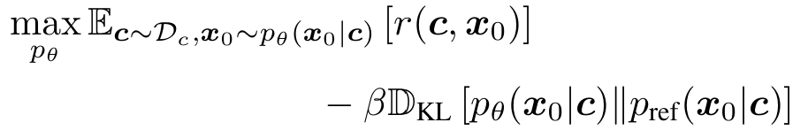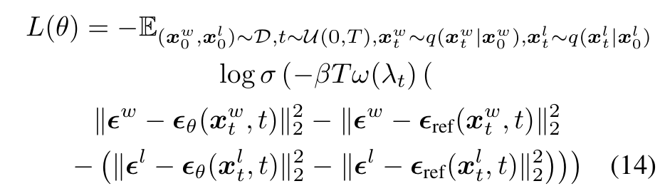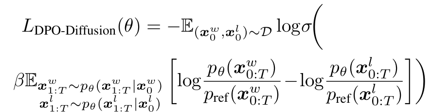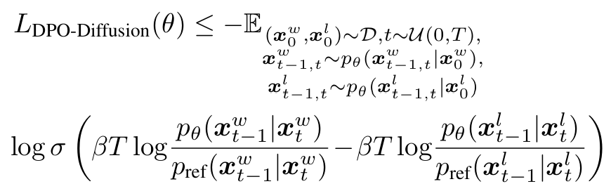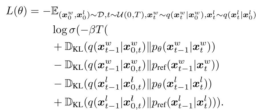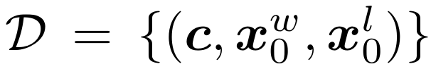 - 사용자가 프롬프트 condition $c$에 대해 두 이미지 $x_0^w\succ x_0^l | c$ 중 어떤 것을 더 선호하는지 정보만 있다고 가정