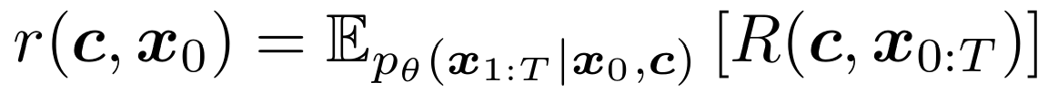 이를 해결하기 위해 evidence lower bound(ELBO)를 사용, 잠재 변수 $x_{1:T}$를 도입, 전체 경로에 대한 보상 $R(c,x_{0:T}$를 정의