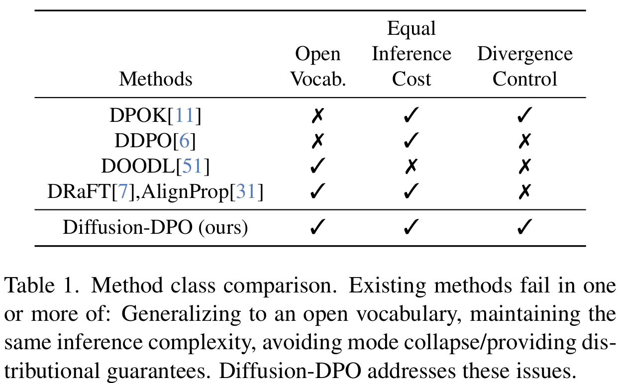 - Diffusion-DPO라는 새로운 방법 제안: human preference data로 직접 diffusion 모델을 optimize.