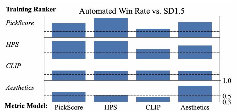 - 자동 검증: Pick-a-Pic validation set에서 500개 프롬프트로 PickScore 사용