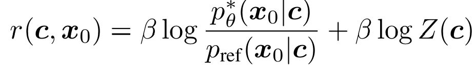 위의 DPO 유도 과정과 마찬가지로 위 식의 최적해를 구해 보상함수를 정의하고 이를 다시 Bradley-Terry likelihood에 대입하면 $p_theta(x_{0:T}|c)$를 바로 최적화하는 식을 얻을 수 있음