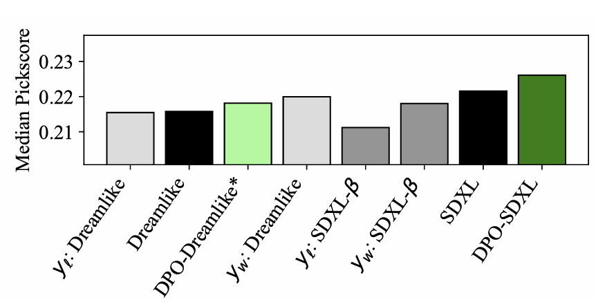 DPO 학습을 통해 성능이 더 향상됨. - 실험: Pick-a-Pic 중 **Dreamlike 모델로 생성된 서브셋(15%)**만 사용해 DPO 학습