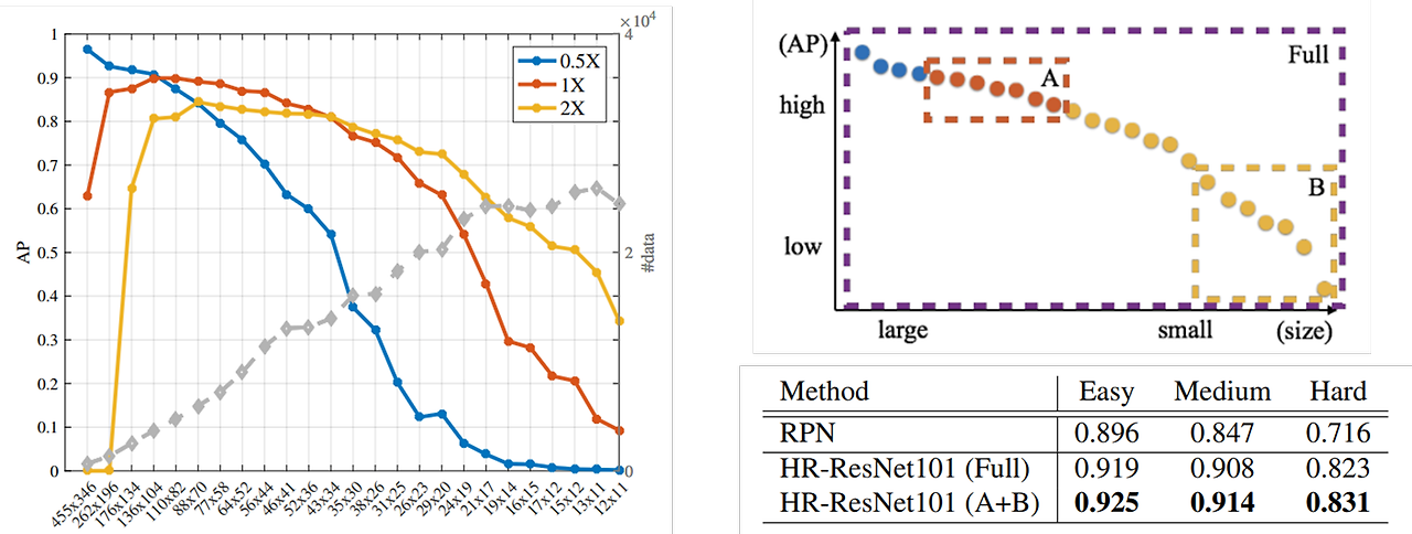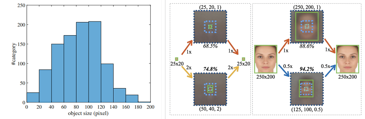 아래 오른쪽 그림에서 작은 얼굴은 사이즈를 2배 키웠을 때 약 10% 정도의 성능 향상을 가지고, 큰 얼굴은 사이즈를 2배 줄였을 때 약 5% 정도의 성능 향상을 가지고 있다. 즉 무조건 얼굴 사이즈가 크다고 성능 향상과 직결되지는 않는다고 주장한다. 그래서 논문 저자들은 객체의 크기보다 크기들의 분포에 이슈가 있다고 말한다.