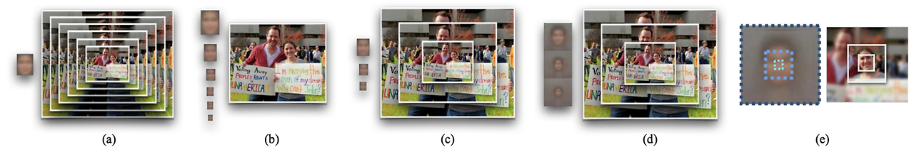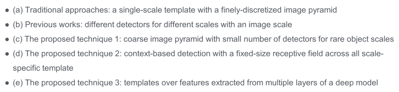 첨부된 이미지에 표시된 각 항목은 위 설명된 기술들을 나타냅니다. (a)는 전통적인 단일 스케일 템플릿과 세밀하게 구분된 이미지 피라미드 방식을, (b)는 이미지 스케일에 따른 다양한 검출기를 사용한 이전 연구들의 방식을 나타냅니다. (c), (d), (e)는 각각 새롭게 제안된 기술들로, 드문 객체 스케일에 적합한 간략화된 이미지 피라미드, 맥락 기반 탐지, 그리고 깊은 모델의 여러 레이어에서 추출된 특징을 활용한 템플릿입니다. 이 기술들은 각기 다른 크기의 얼굴을 효과적으로 탐지하기 위한 새로운 접근법을 보여줍니다.