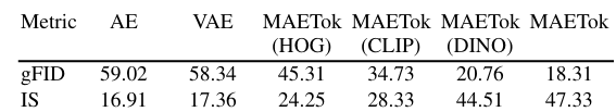 - MAETok은 단순 AE 구조임에도 불구하고 mask modeling과 multi-target reconstruction을 통해 SOTA 성능을 달성하였다.