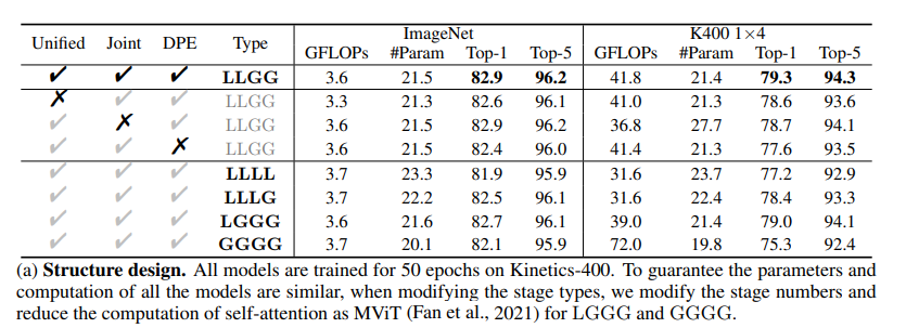 DPE의 커널 크기는 이고 (T×H×W), 모든 FFN의 확장 비율(expand ratio)은 4이다.