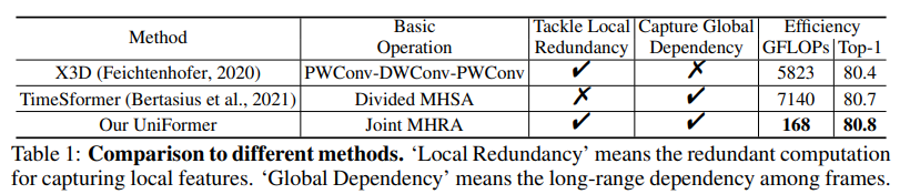 이때 3D CNN은 receptive field 내에서 정보를 처리하기 때문에 local feature를 잘 파악하는 동시에 local redundancy(중복)을 잘 제거할 수 있지만 global 관계를 포착하는데는 약점을 보인다. 반면 vision transformer는 global feature는 잘 포착하지만 연산량이 너무 많고 local redundancy(중복)을 잘 제거하지 못한다는 단점을 가진다.