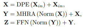 DPE를 통해 모든 토큰에 3D 위치 정보를 동적으로 통합하고 MHRA를 통해 각 토큰이 주변 문맥 토큰들과 정보를 집계(aggregation)하도록 하며 FFN을 통해 각 토큰을 개별적으로 강화(pointwise enhancement)한다. 이때 입력은 텐서 Xin ∈ ℝ^{C×T×H×W} (채널×시간×높이×너비)이다.