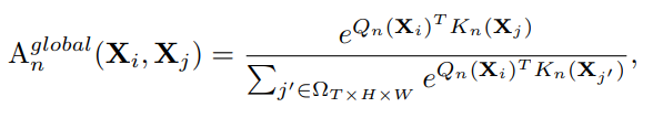 깊은 layer에서는 전체 비디오 클립 내에서 장기적인 토큰 간 의존성(capturing long-term token dependency)을 포착하는 데 집중하기 위해 self-attention과 유사한 구조를 따른다. global MHRA는 큰 구조는 local MHRA와 동일하지만 affinity vector를 다른 방식으로 구하게 된다.
