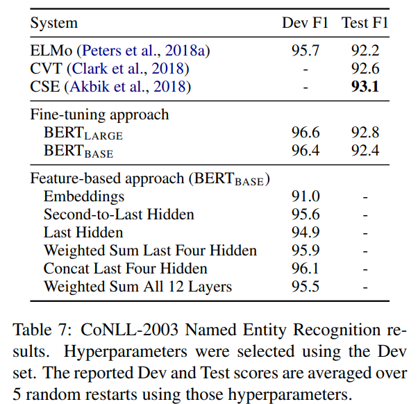- Concat Last Four Hidden: 상위 4개 layer의 representation을 concat했을 때 Dev F1 최고 (96.1)
