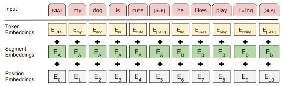 - Token embedding + Segment embedding (문장 A/B 구분) + Position embedding 두개의 다른 문장이 있는걸 알려주는 segment embedding Position embedding : token의 상대적 위치정보를 알려줌. sin,cos함수 사용.