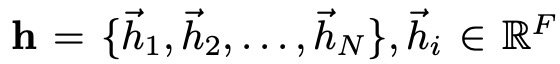 N이 노드의 개수, F가 feature의 차원일 때, 입력은 다음과 같이 정의되고 이는 각각 h’을 생성한다.