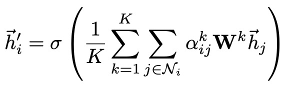 이는 2017년 Transformer의 아이디어와 유사하다. 다음 수식은 GAT의 중간 히든 레이어에서 사용되는 Multi Head Attention 수식이다.