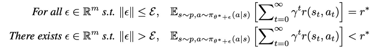 임의의 파라미터 교란 입실론에 대해 그 크기가 일정 수준 이하일 경우, 교란된 정책을 따라 행동하더라도 기대 누적 보상은 여전히 r* 이지만 그 수준을 벗어날 경우 교란은 보상을 떨어뜨리게 된다.