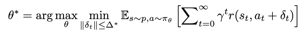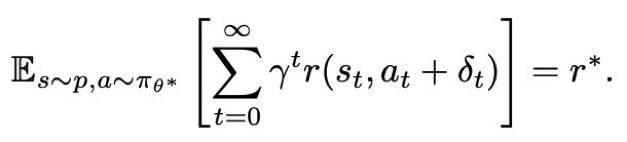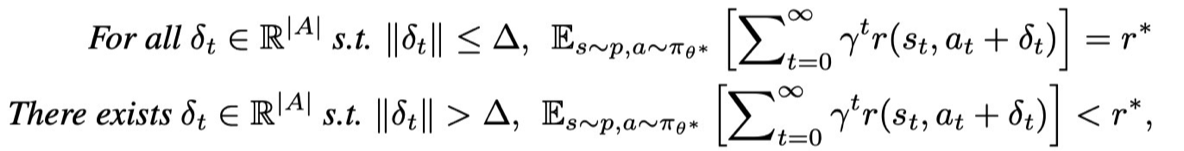 perturbation으로 인해 생긴 행동 교란의 크기가 델타 이하일 경우 그 교란이 더해지더라도 보상이 r*로 유지된다. 즉 작은 오차에 대해서는 성능이 떨어지지 않는다.