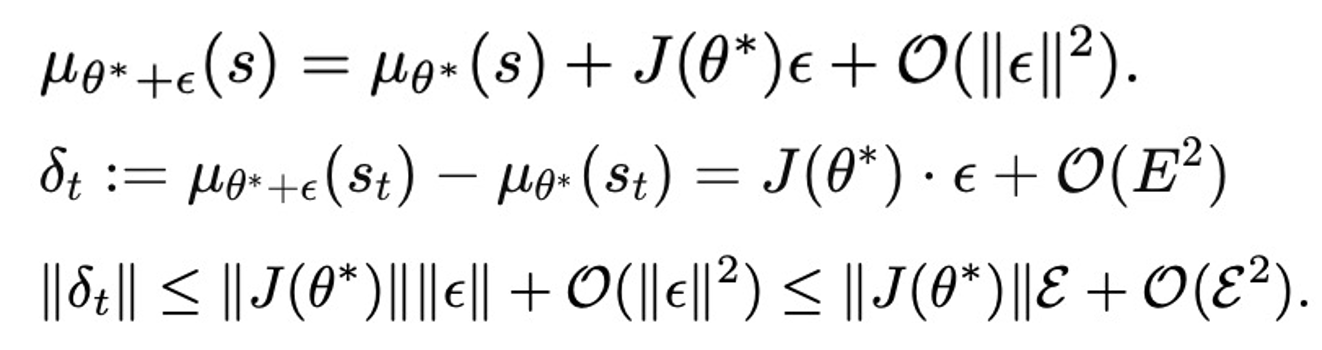 다음과 같다. 즉 perturbation으로 인한 행동 변화 델타가 파라미터 세타에 대한 야코비안 행렬과 perturbation의 곱 이하일 때, Reward가 유지된다는 뜻이다.