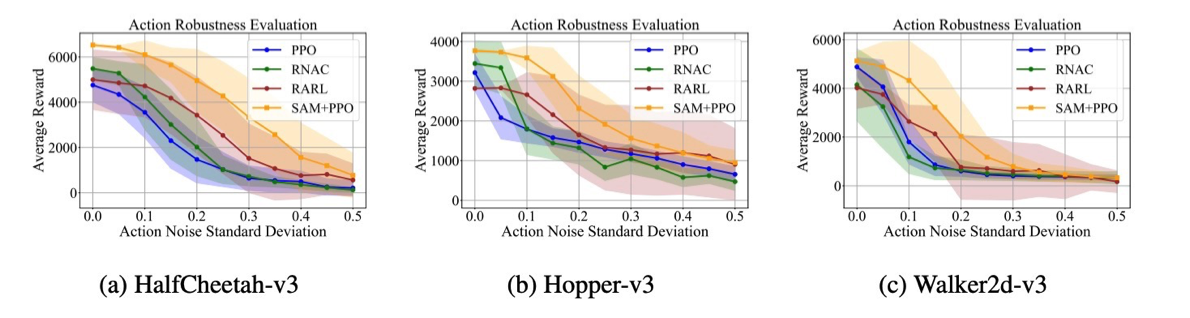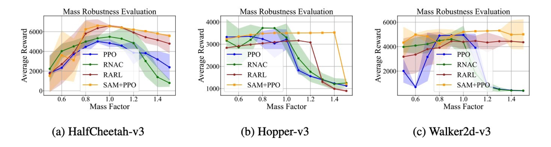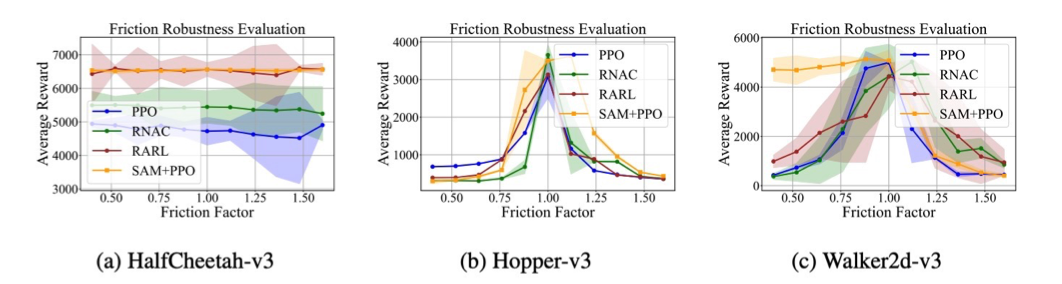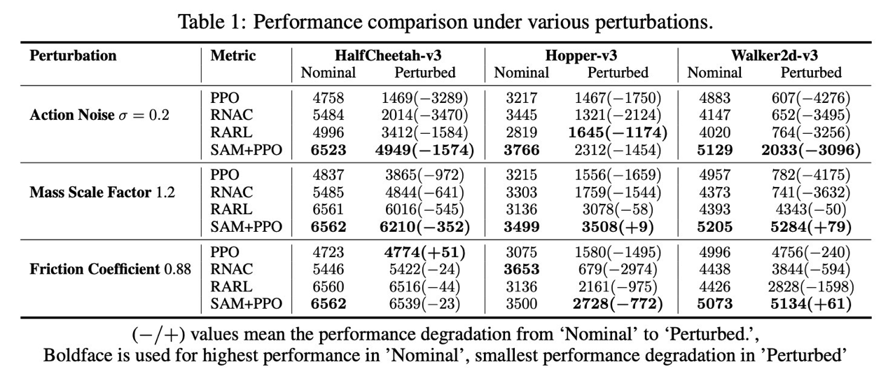 마찰, 질량 등에 대해서 노이즈를 가했을 때도 SAM+PPO 방식이 거의 가장 높은 성능과 강건성을 보였다.