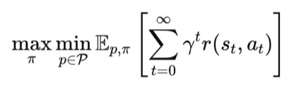 이러한 전이확률로 인한 강건성을 향상시키기 위해 등장한 개념이 Robust MDP이다. 아래 수식을 참조하면, 하나의 전이확률을 사용하는 대신 전이확률 집합을 가정하고, 그 중 최악의 성능을 보여주는 상황을 가정하고, 그 상황에서 보상을 최대화시키는 방식이다.